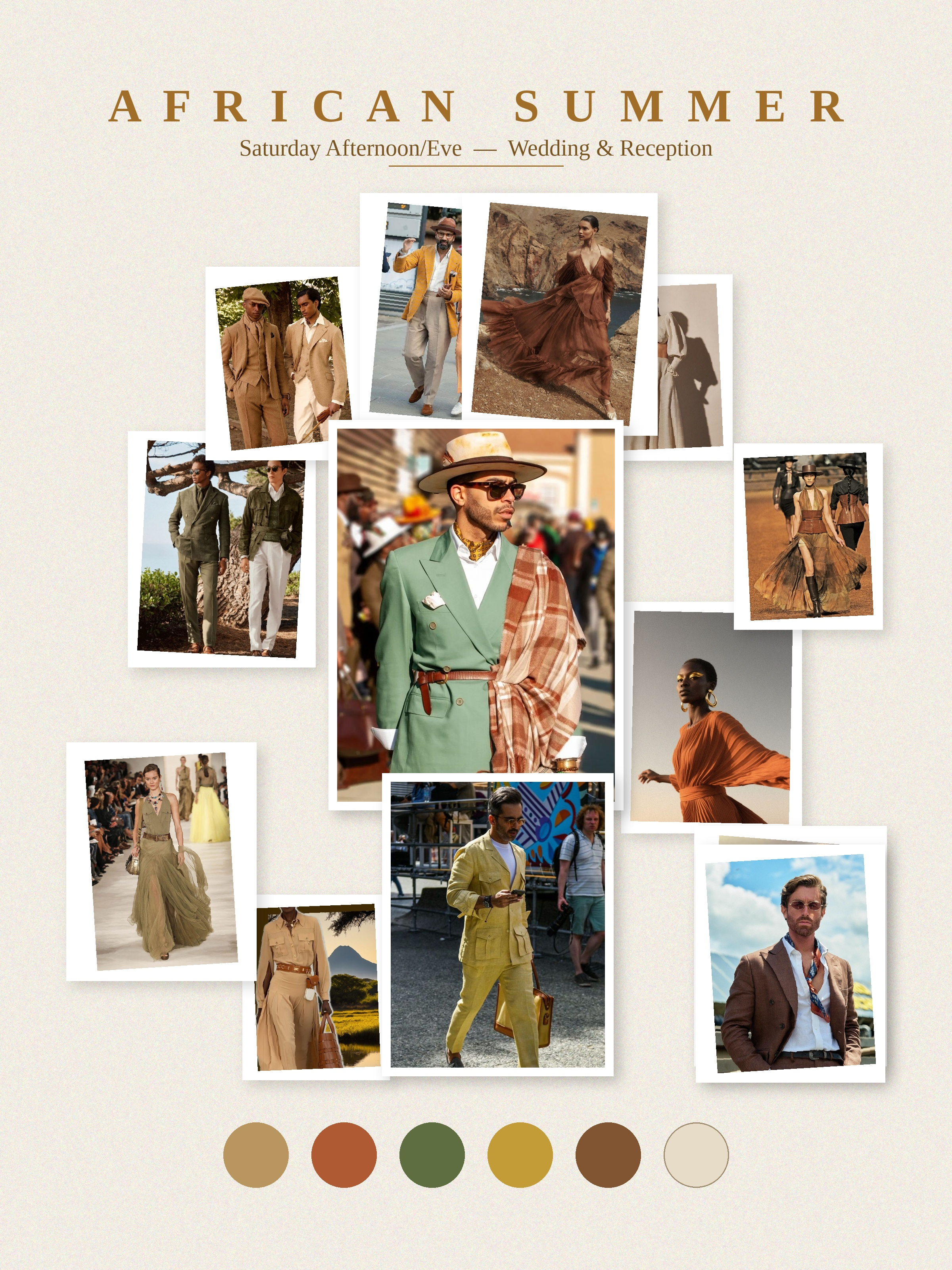 Think summer wedding — but in the savannah. Linen jackets. Flowy dresses. Earth tones: sand, clay, olive, rust, ivory. Natural fabrics. Movement. Ease.
